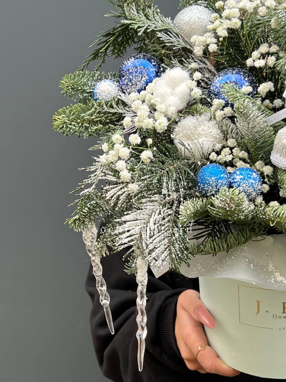 Датский нобилис сочетается с воздушной гипсофилой и красными игрушками в праздничном боксе. Хлопок и декоративные сапожки создают тёплую зимнюю картину прямо на столе.