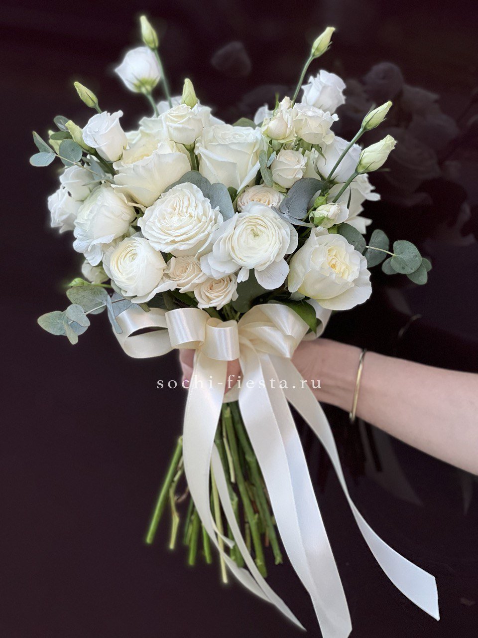эустома, белые одноголовые розы, сезонный цветок (фрезия / альстромерия / эустома), эвкалипт, лента.