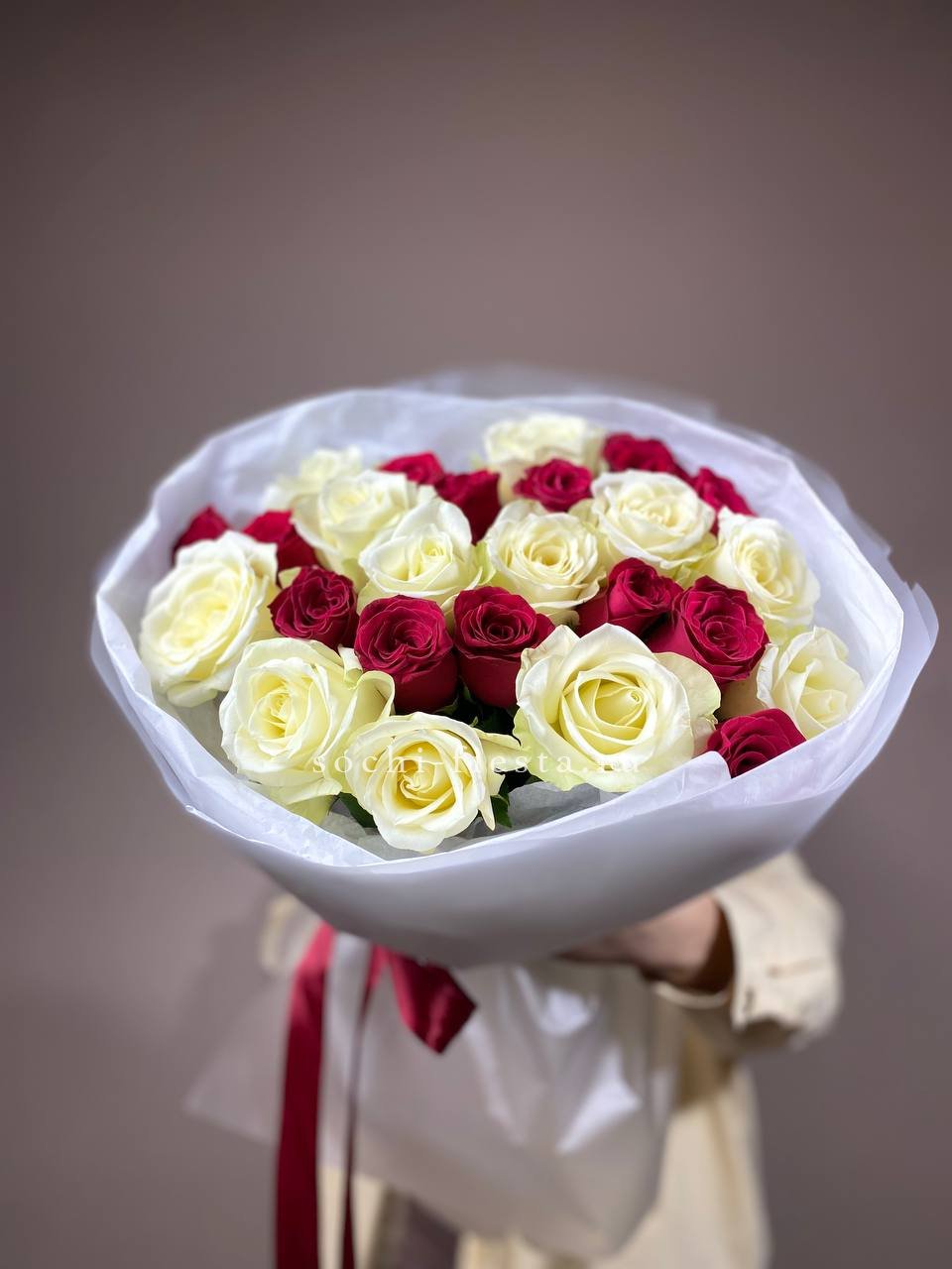Для заказа товара "Букет их красных и белых 25 роз" с доставкой в Новороссийске нажмите в корзину