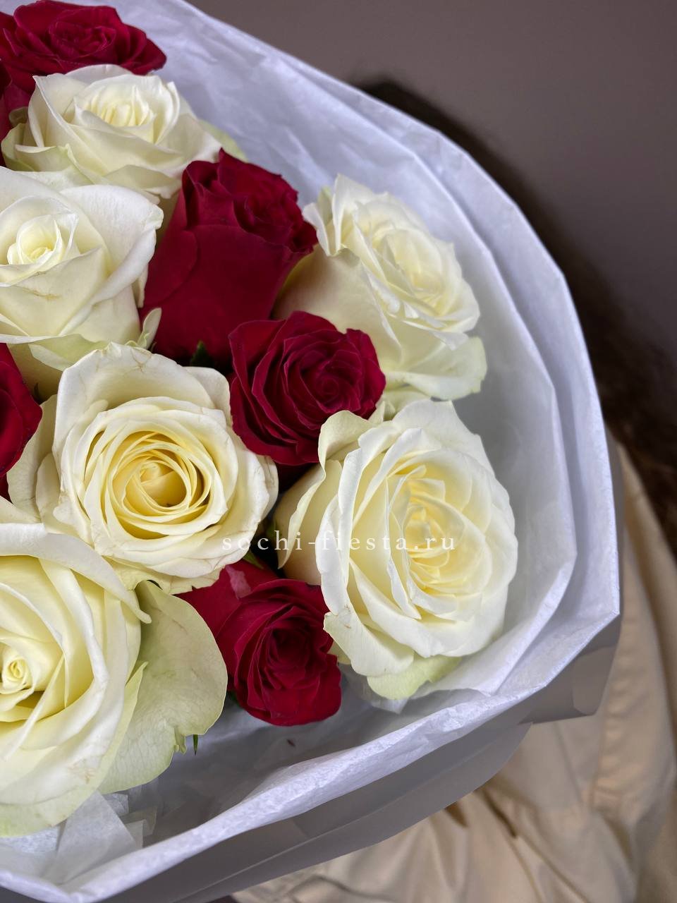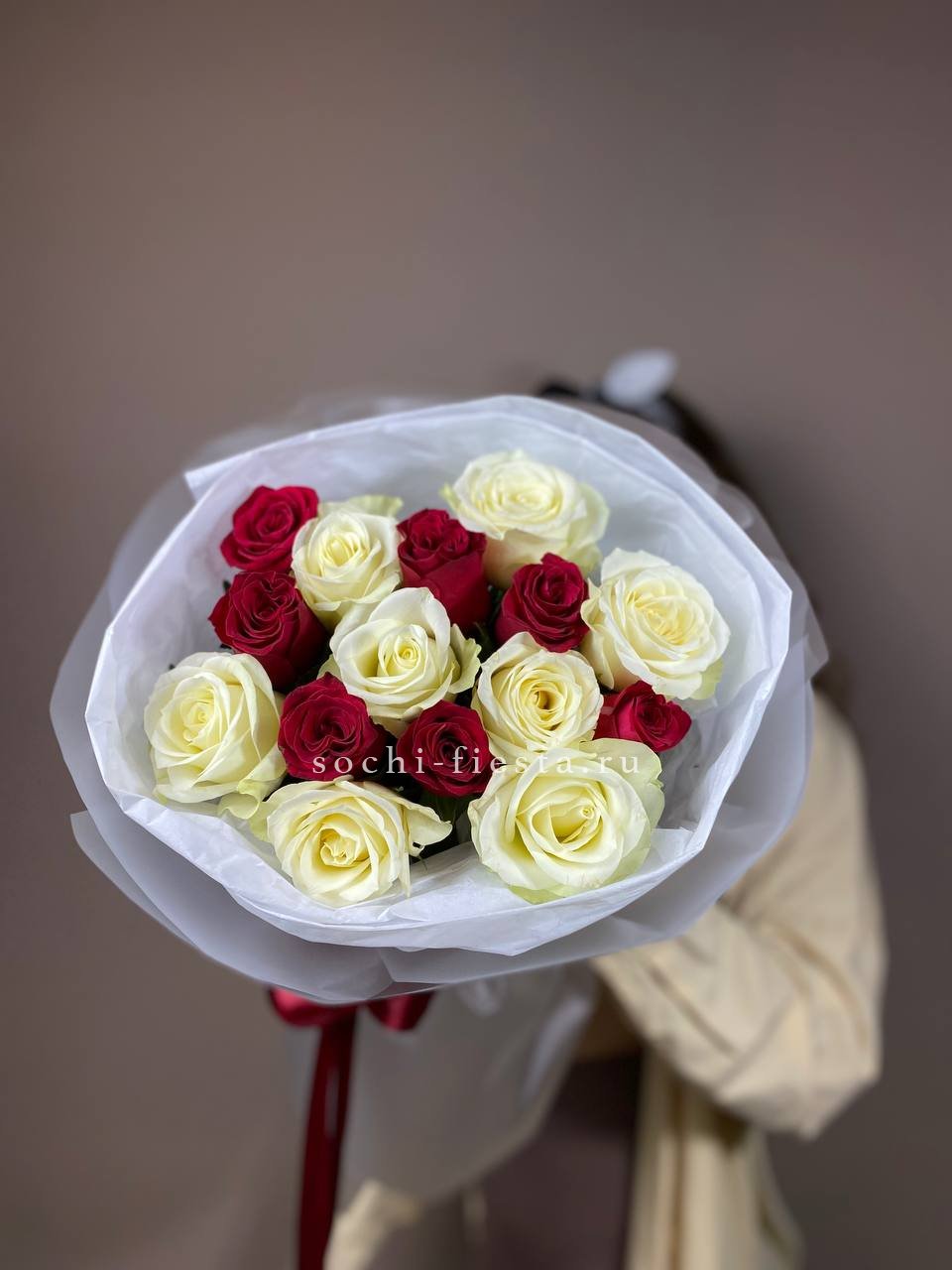 Для заказа товара "Букет из красных белых 15 роз" с доставкой в Новороссийске нажмите в корзину