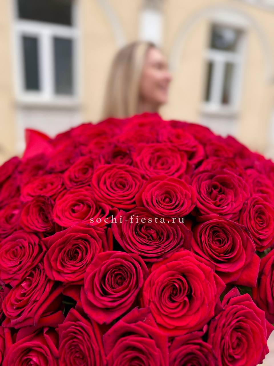 Сто одна белая роза собрана в впечатляющую охапку. Монохромная гамма и повторяющийся ритм бутонов создают мощное визуальное присутствие. Такой объём заполняет пространство и приковывает внимание.
