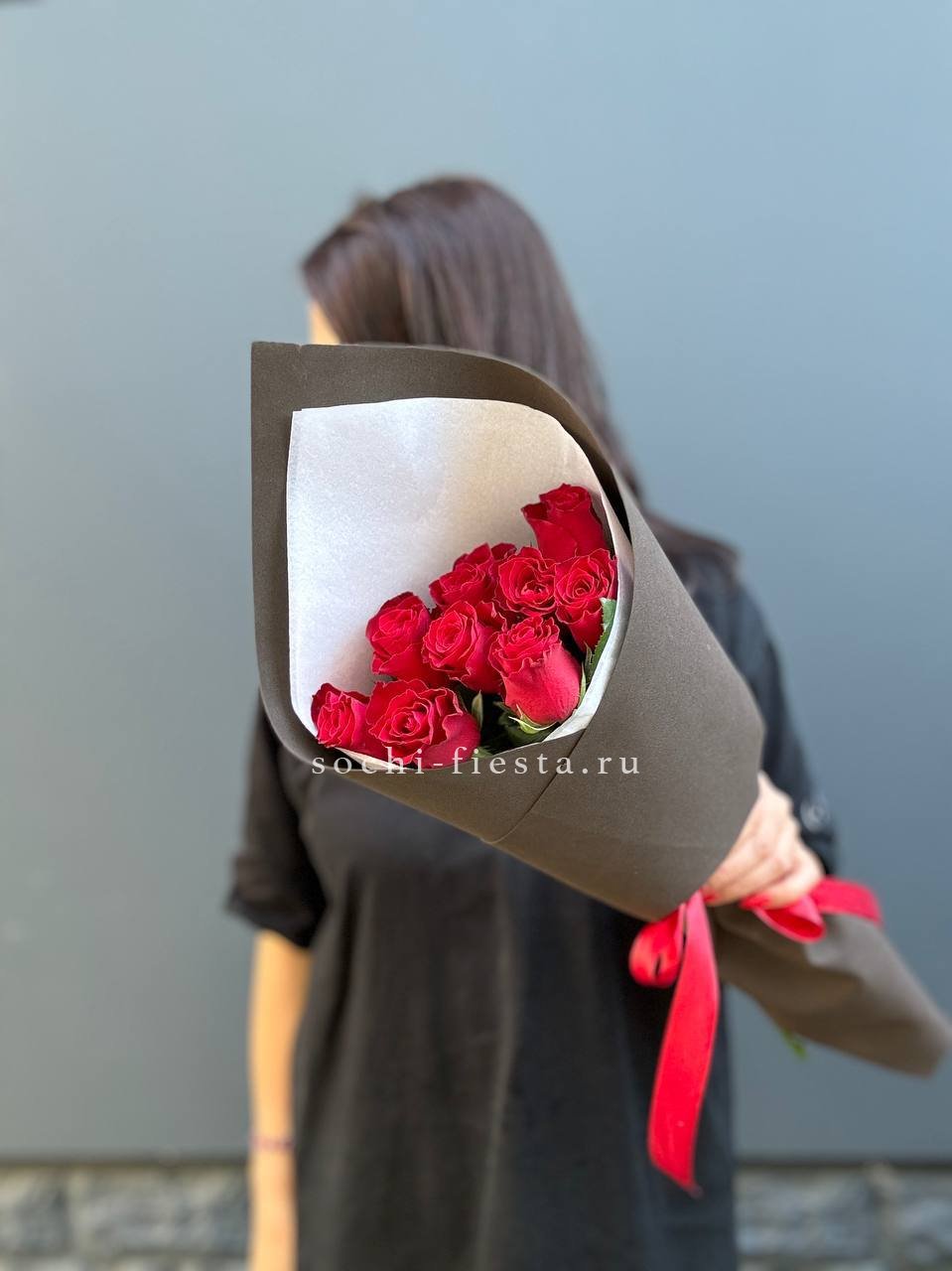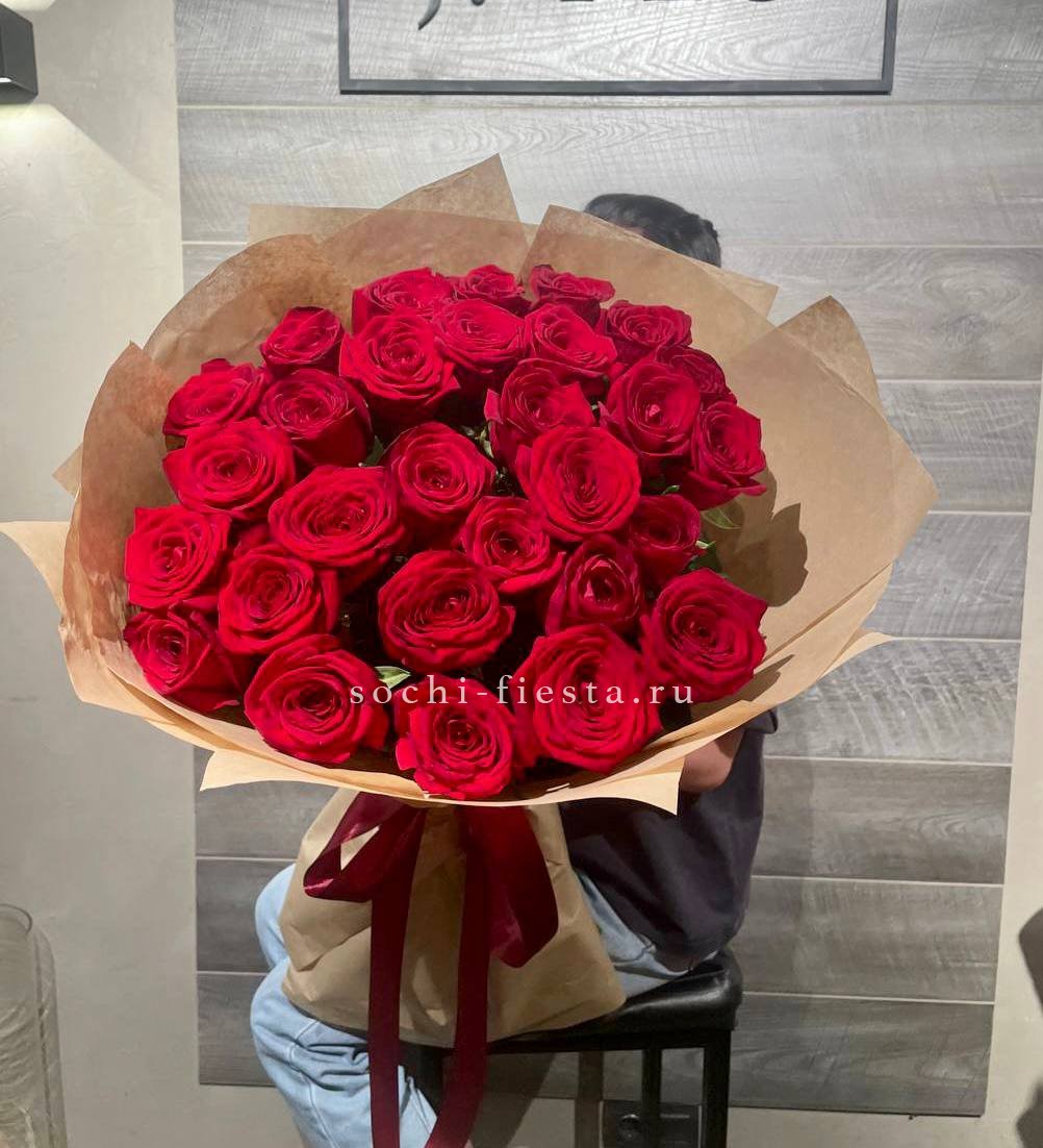 Двадцать пять красных роз в дизайнерской упаковке выглядят уверенно и сдержанно. Плотный силуэт букета подходит для выражения чувств без лишних слов.