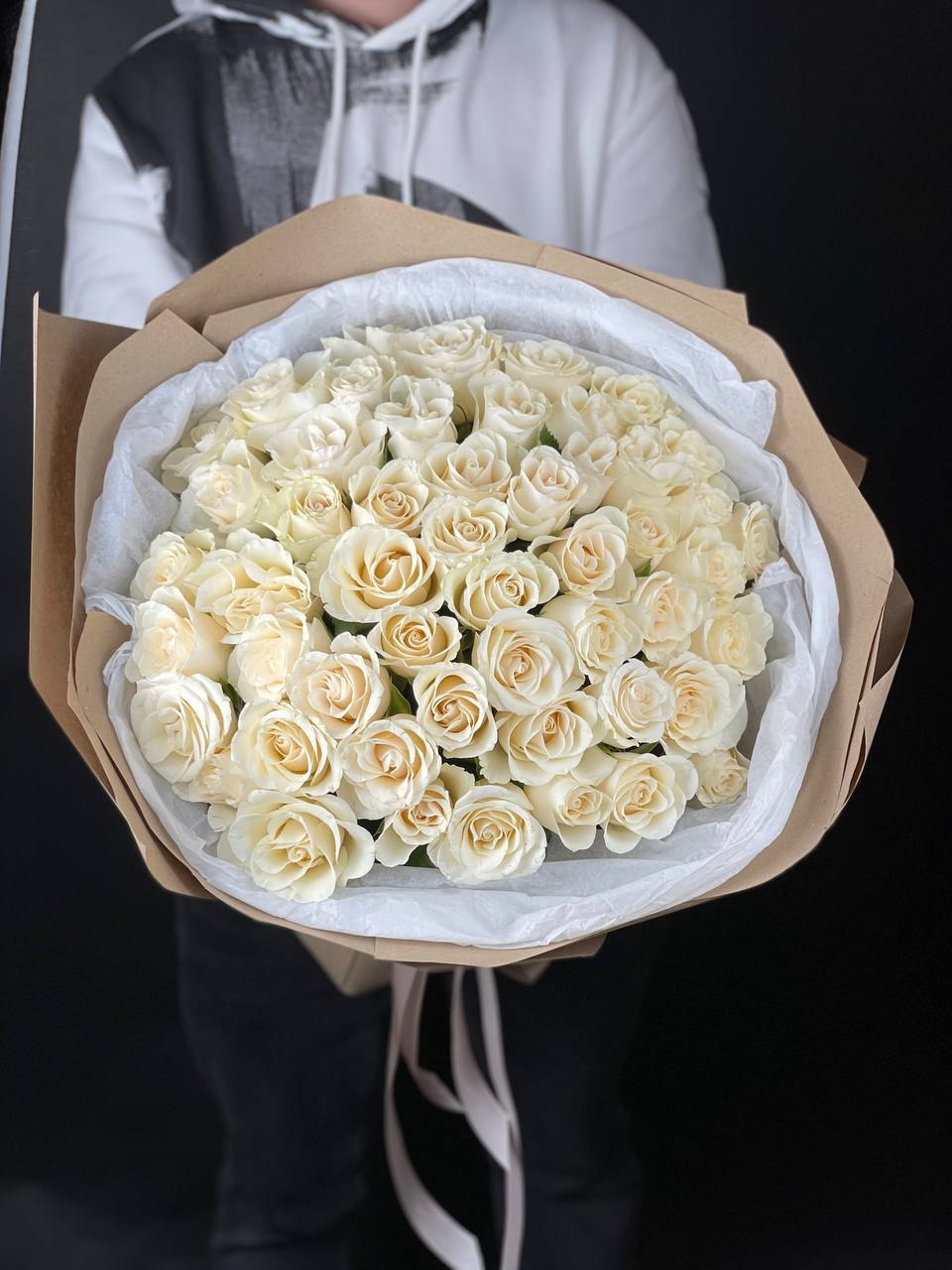 Белые головки собраны в плотный купол без единого просвета. Пятьдесят один бутон создает монолитную форму, где каждый цветок поддерживает соседний. Лаконичная упаковка сохраняет чистоту линий и фокус на безупречной геометрии композиции.
