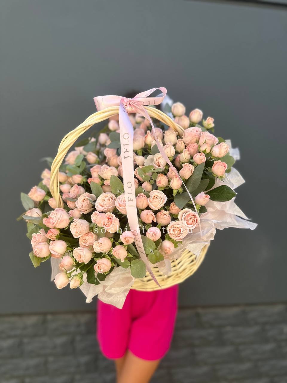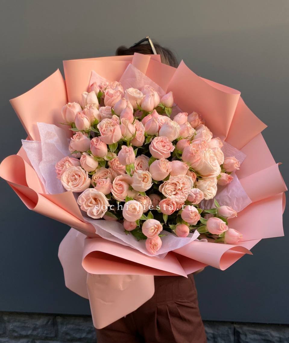 Двадцать пять кустовых роз Бомбастик собраны в пышную композицию с выраженной округлой формой. Плотные многолепестковые бутоны располагаются близко друг к другу, создавая насыщенный визуальный ритм и объемную структуру букета.