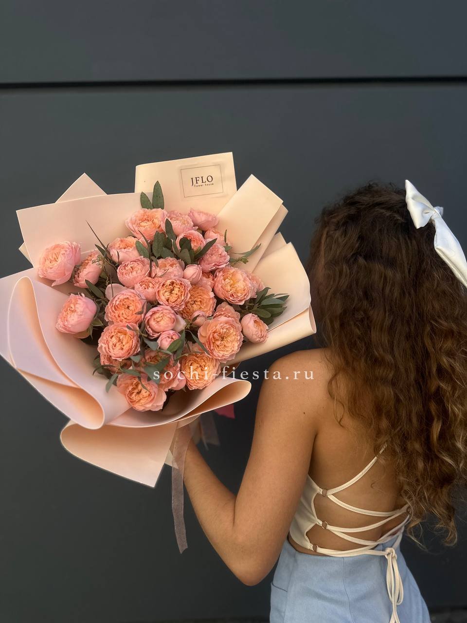 яркий букет из 11 пионовидных кустовых роз с эвкалиптом.