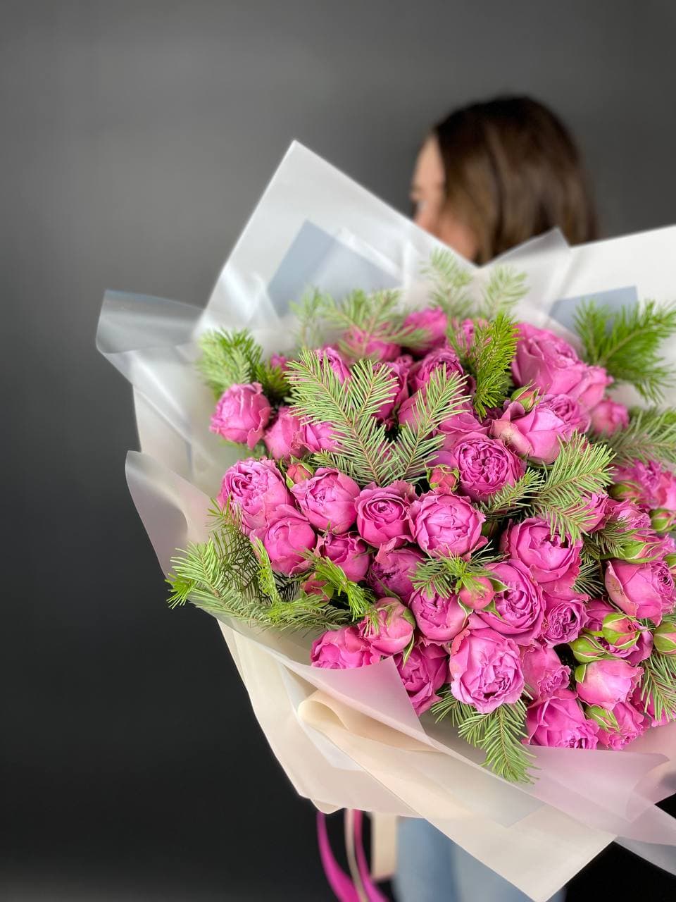 роза Мисти Баблс, ветки нобилиса, лента, дизайнерская упаковка.