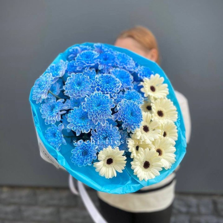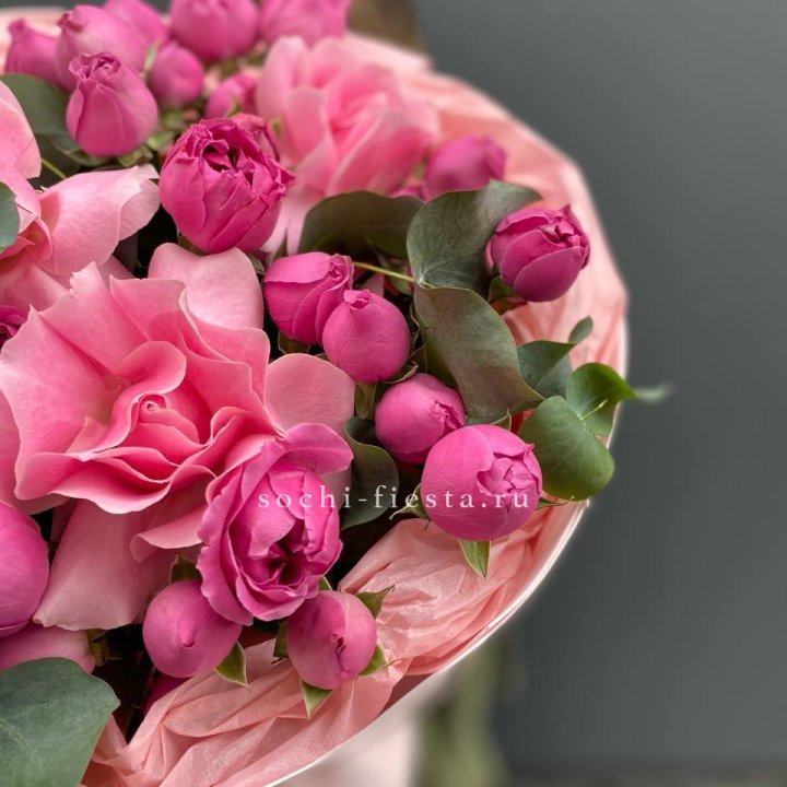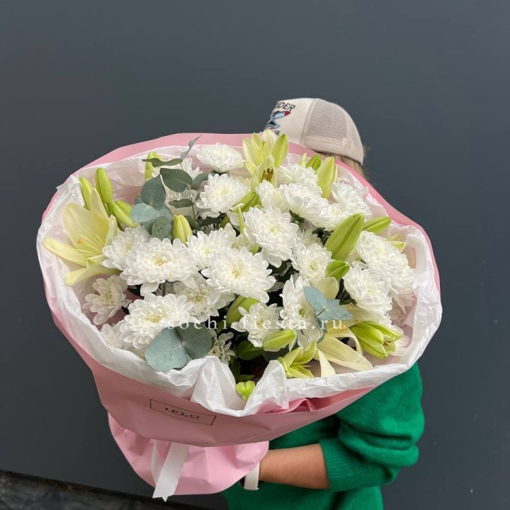 Зима и лето в Новороссийске — розы и хризантемы как основа. Эти виды стабильны в поставках круглый год. Флорист дополняет их сезонными акцентами: хвойные ветви зимой, открытая эустома летом. Сборный букет в любое время года выглядит живым и актуальным.