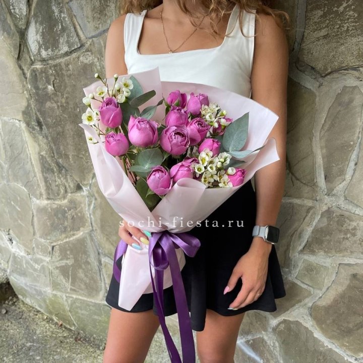 Основа сборных букетов в Новороссийске: розы (Freedom, Mondial, Avalanche), хризантема кустовая, альстромерия, эустома, фрезия, вероника. Дополнительно — ранункулюсы в сезон, хризантема одиночная, ирис весной, тюльпаны в апреле. Состав зависит от текущей поставки и сезона. Флорист всегда предлагает то, что в лучшей форме прямо сейчас.