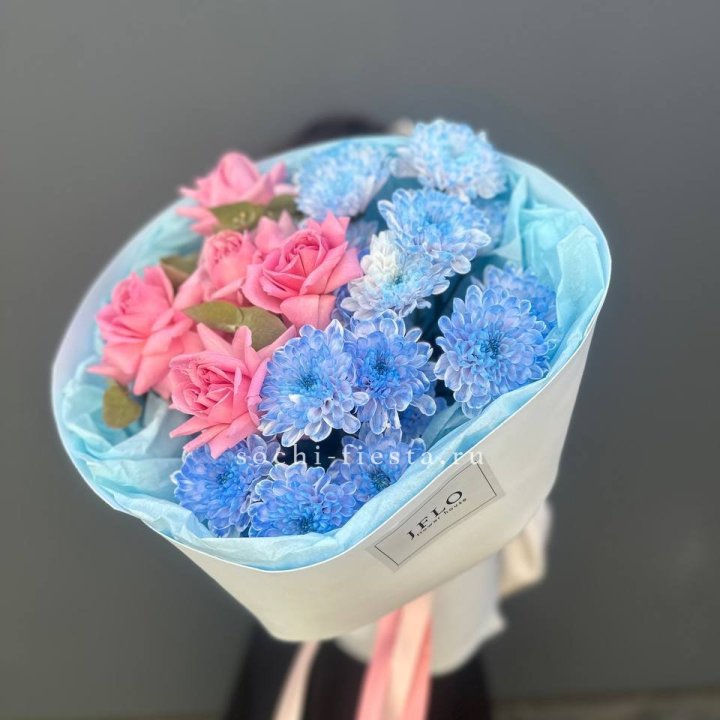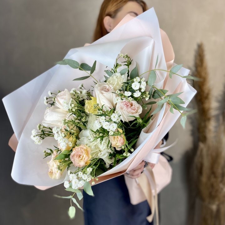 Зима и лето в Новороссийске — розы и хризантемы как основа. Эти виды стабильны в поставках круглый год. Флорист дополняет их сезонными акцентами: хвойные ветви зимой, открытая эустома летом. Сборный букет в любое время года выглядит живым и актуальным.