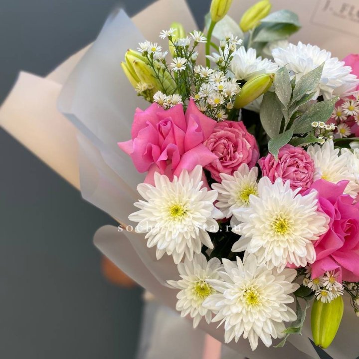 Зима и лето в Новороссийске — розы и хризантемы как основа. Эти виды стабильны в поставках круглый год. Флорист дополняет их сезонными акцентами: хвойные ветви зимой, открытая эустома летом. Сборный букет в любое время года выглядит живым и актуальным.