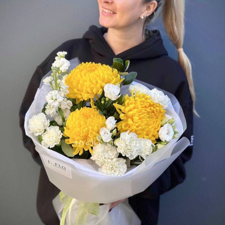 Зима и лето в Новороссийске — розы и хризантемы как основа. Эти виды стабильны в поставках круглый год. Флорист дополняет их сезонными акцентами: хвойные ветви зимой, открытая эустома летом. Сборный букет в любое время года выглядит живым и актуальным.