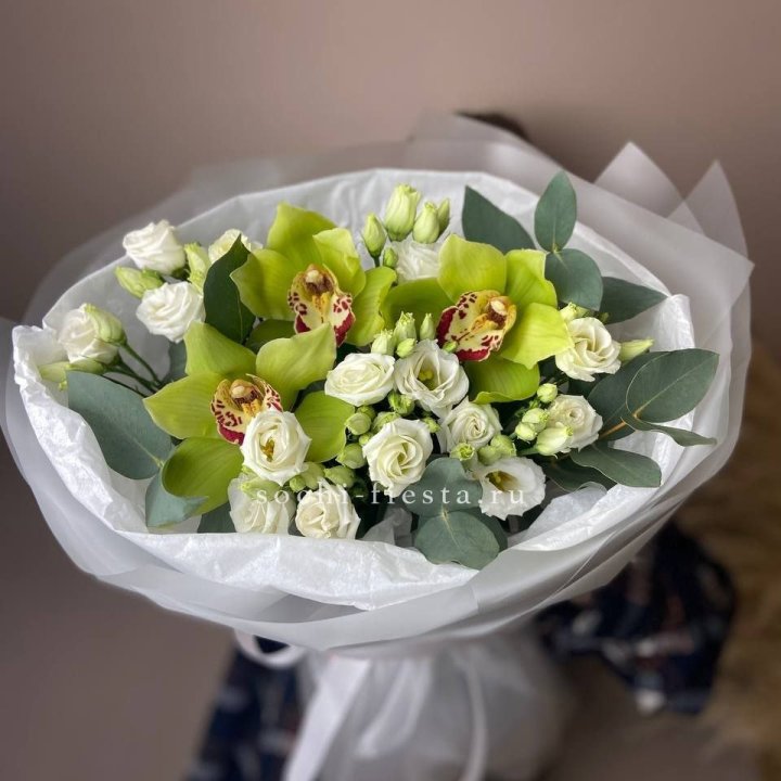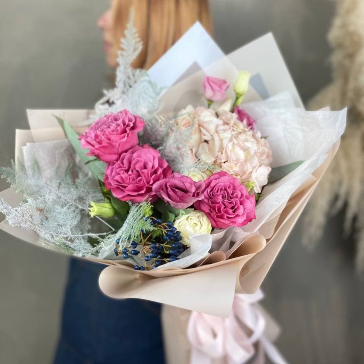 Зима и лето в Новороссийске — розы и хризантемы как основа. Эти виды стабильны в поставках круглый год. Флорист дополняет их сезонными акцентами: хвойные ветви зимой, открытая эустома летом. Сборный букет в любое время года выглядит живым и актуальным.