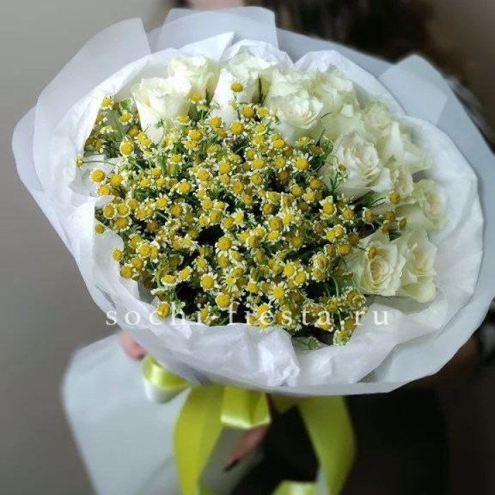Основа сборных букетов в Новороссийске: розы (Freedom, Mondial, Avalanche), хризантема кустовая, альстромерия, эустома, фрезия, вероника. Дополнительно — ранункулюсы в сезон, хризантема одиночная, ирис весной, тюльпаны в апреле. Состав зависит от текущей поставки и сезона. Флорист всегда предлагает то, что в лучшей форме прямо сейчас.