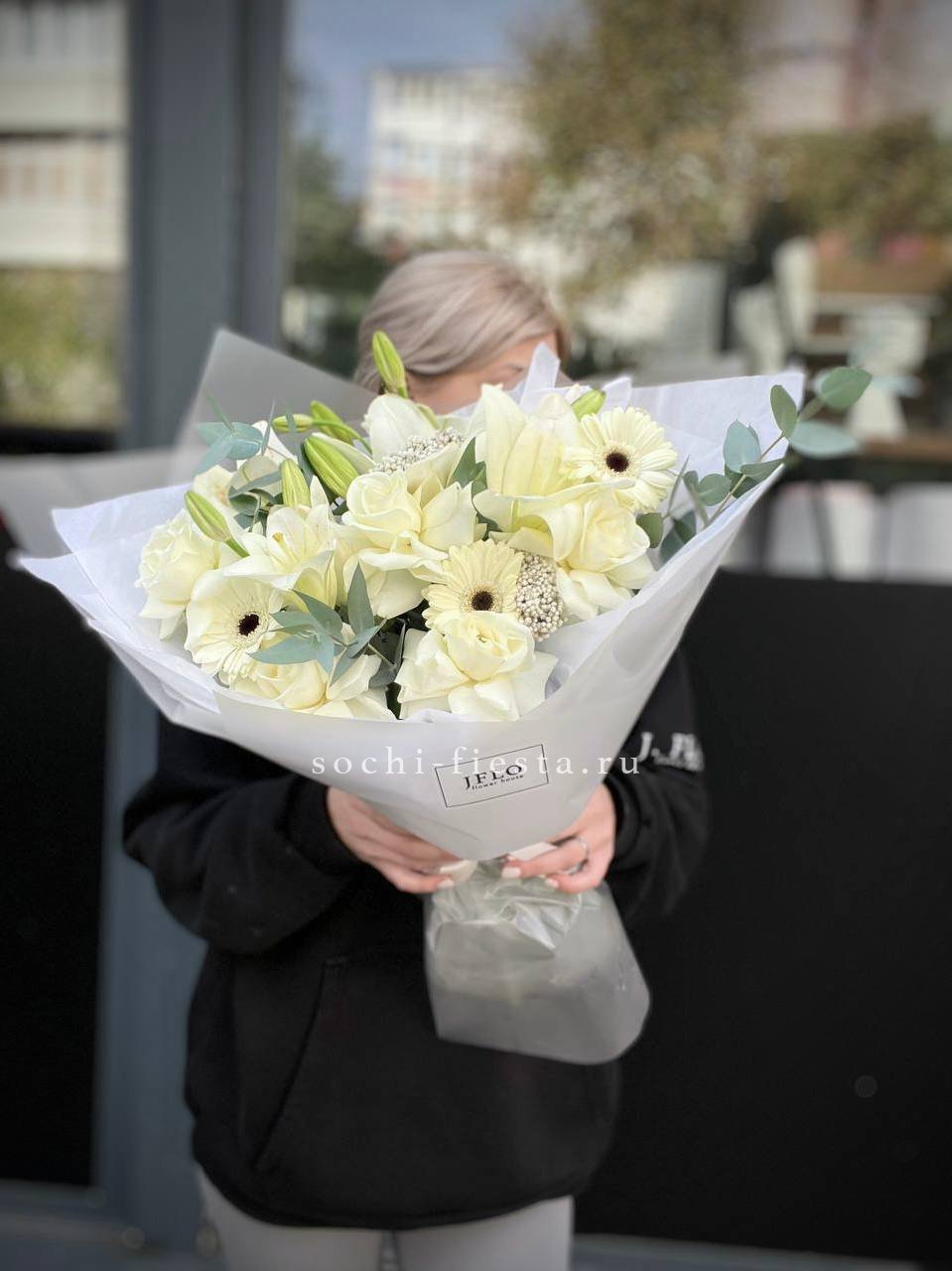 гербера, роза, лилия, озатамус, эвкалипт, упаковка.