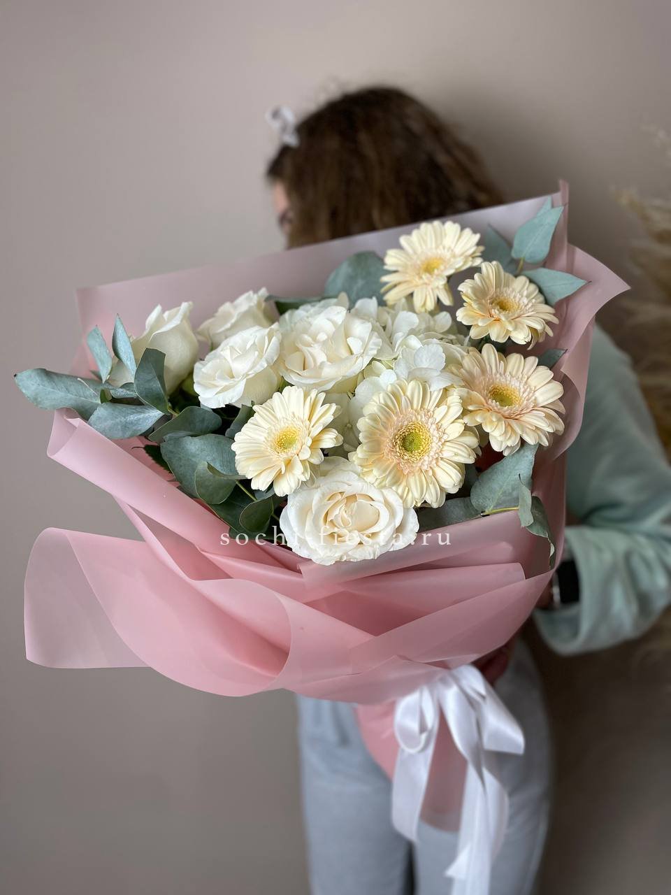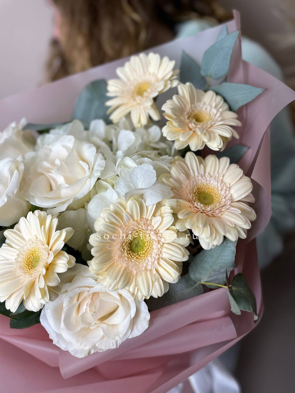 гортензия белая голландская, пионовидная роза Мисти Бабблс, оформление.