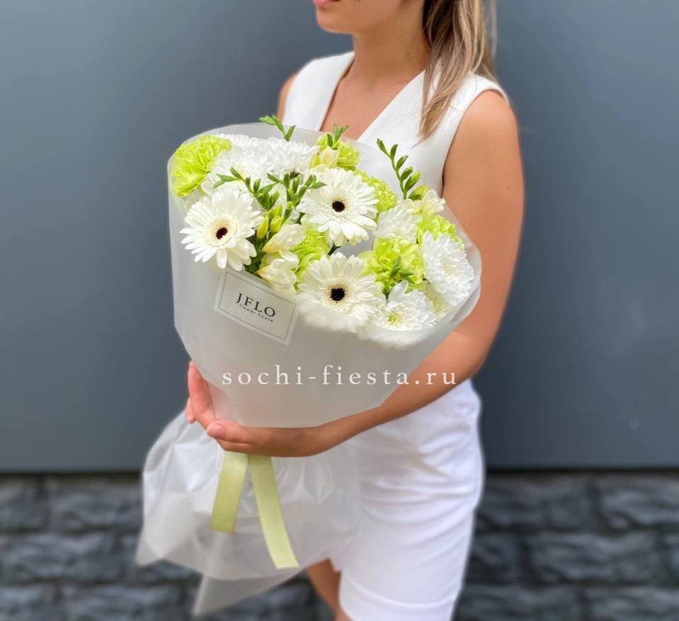 гортензия, герберы,  фрезии, диантусы, хризантемы , лента и дизайнерская пленка.