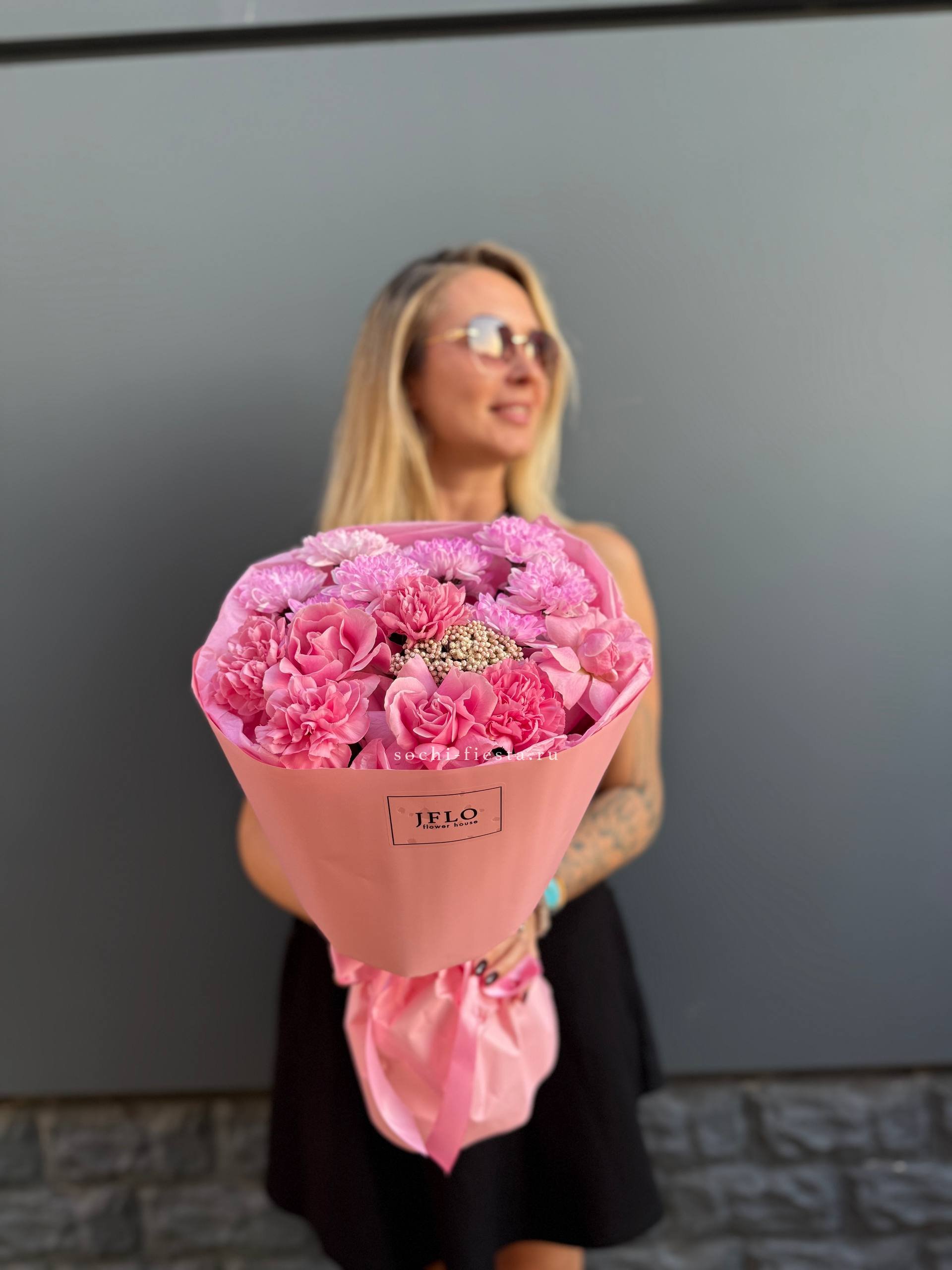 Хризантемы и розы переплетаются с диантусом и озотамнусом в букете насыщенных красок. Каждый цветок раскрывается по-своему, наполняя композицию движением и жизнью.