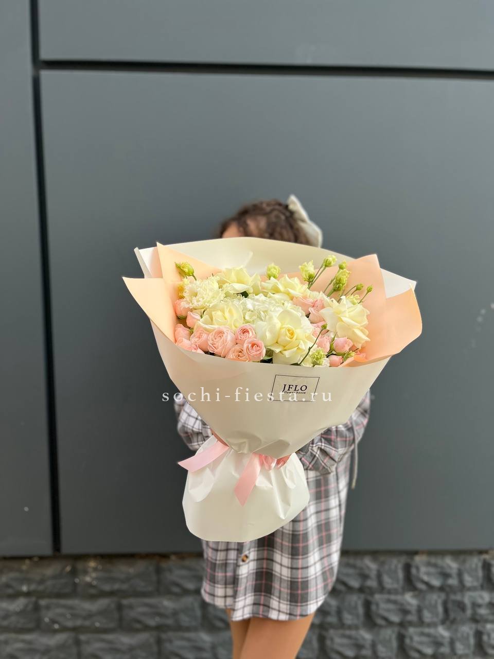 Гортензия образует пышную основу, сквозь которую проступают светлые головки эустомы и роз. Бомбастик вносит графичность, создавая объём и глубину.