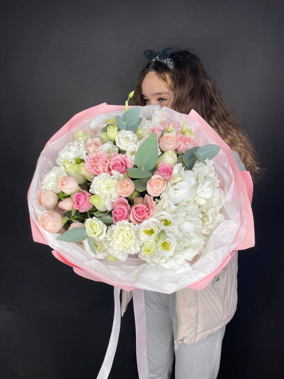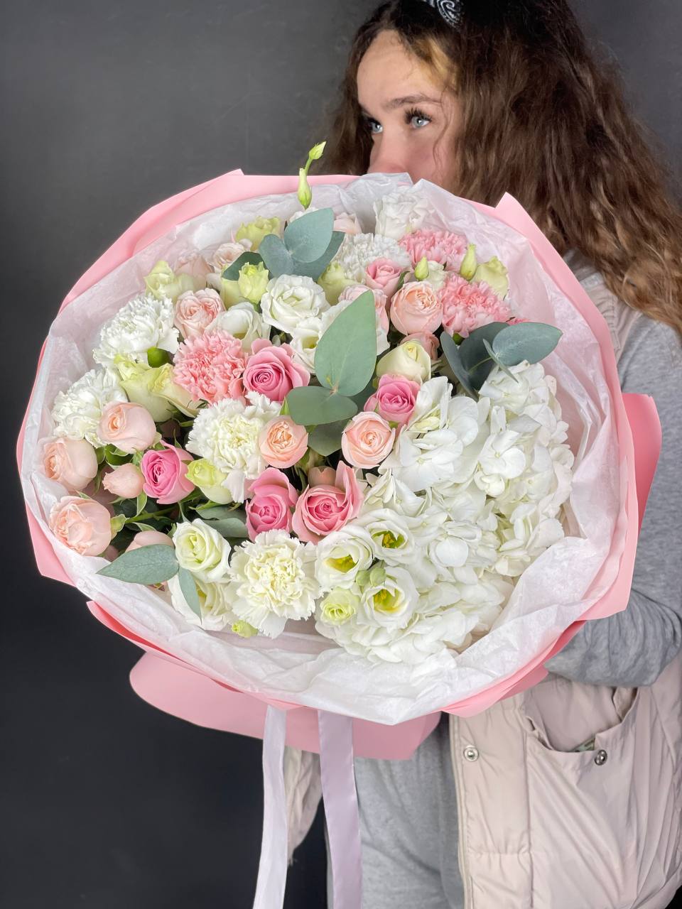 гортензия розовая, розы одноголовые, эустома, эвкалипт, лента, дизайнерская упаковка.