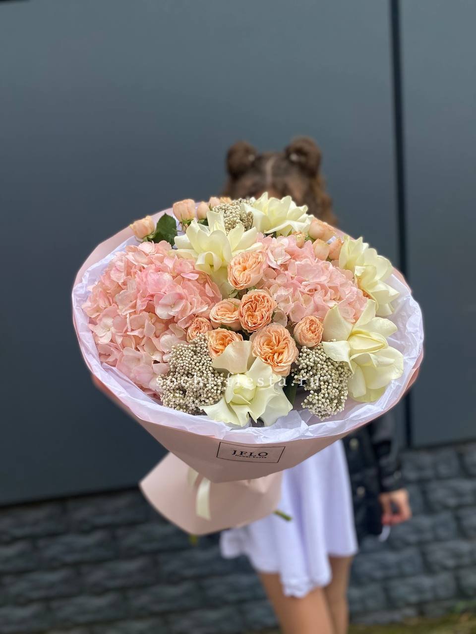 гортензия, пионовидная роза, озотамус, белая роза в нежном оформлении.