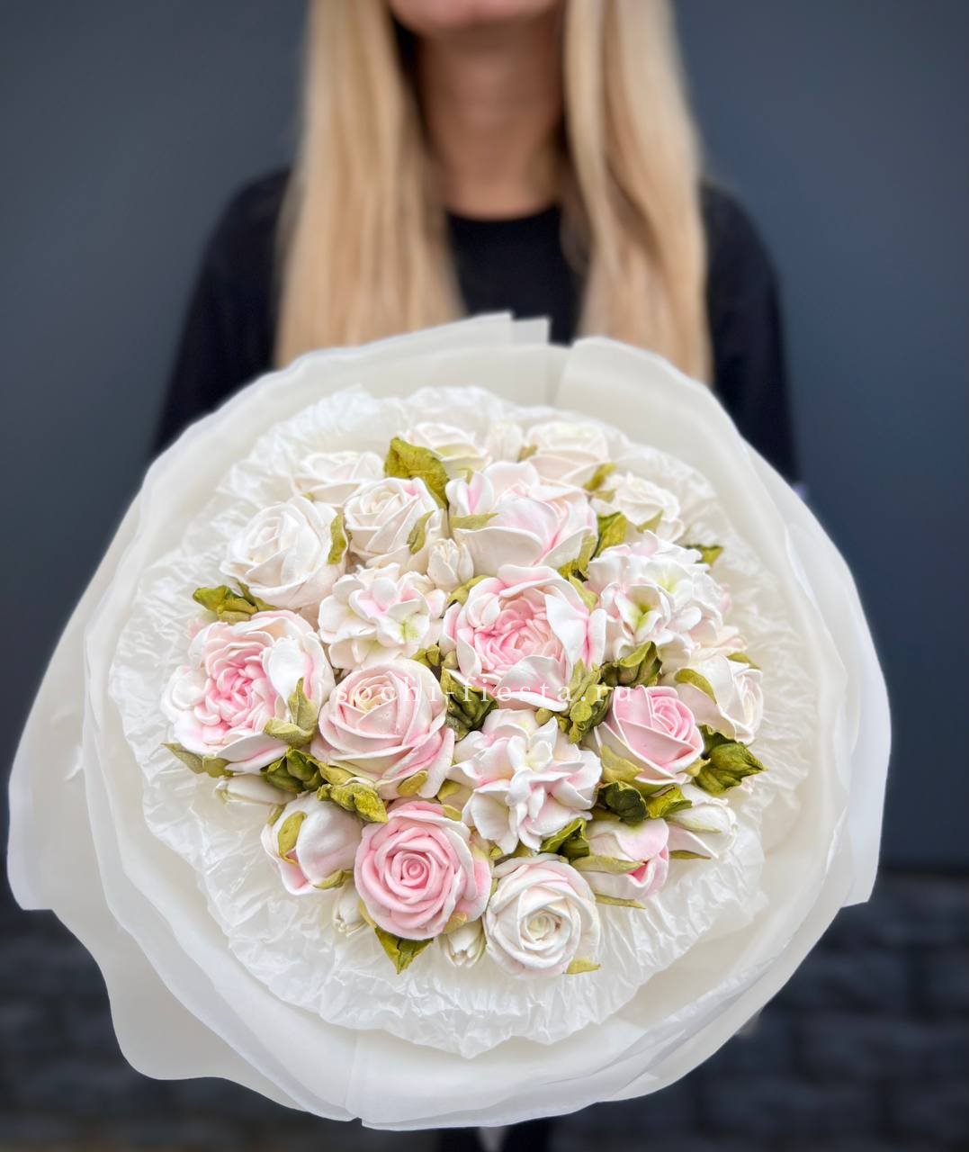 Пастельная гамма с мягкими переходами от кремового к пудровому создаёт спокойное цветовое звучание. Кустовые розы и хризантемы дополнены воздушным лагурусом, который добавляет композиции лёгкости.