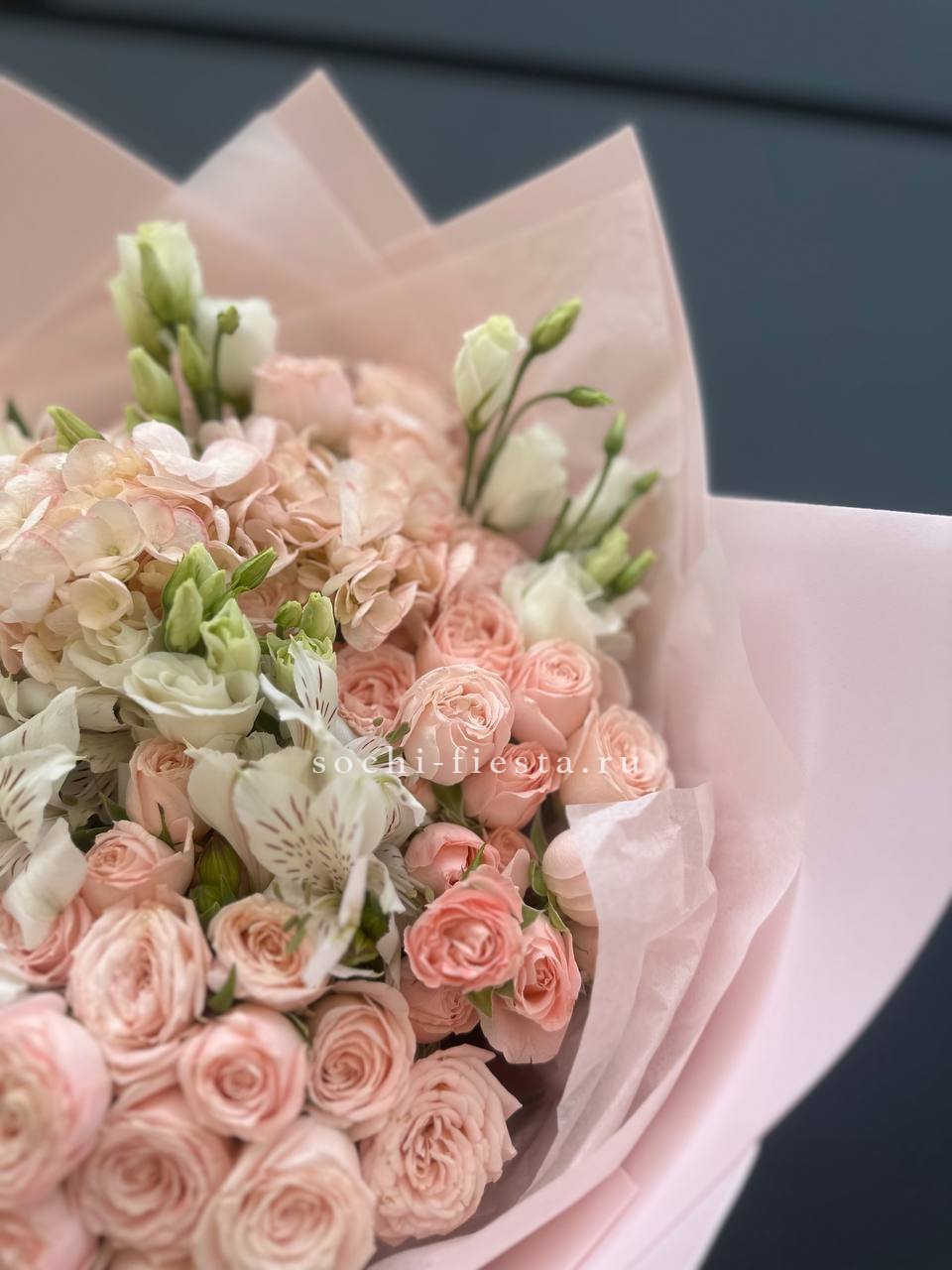 кустовые розы, эустомы, гортензии, альстромерии, лента и дизайнерская пленка.