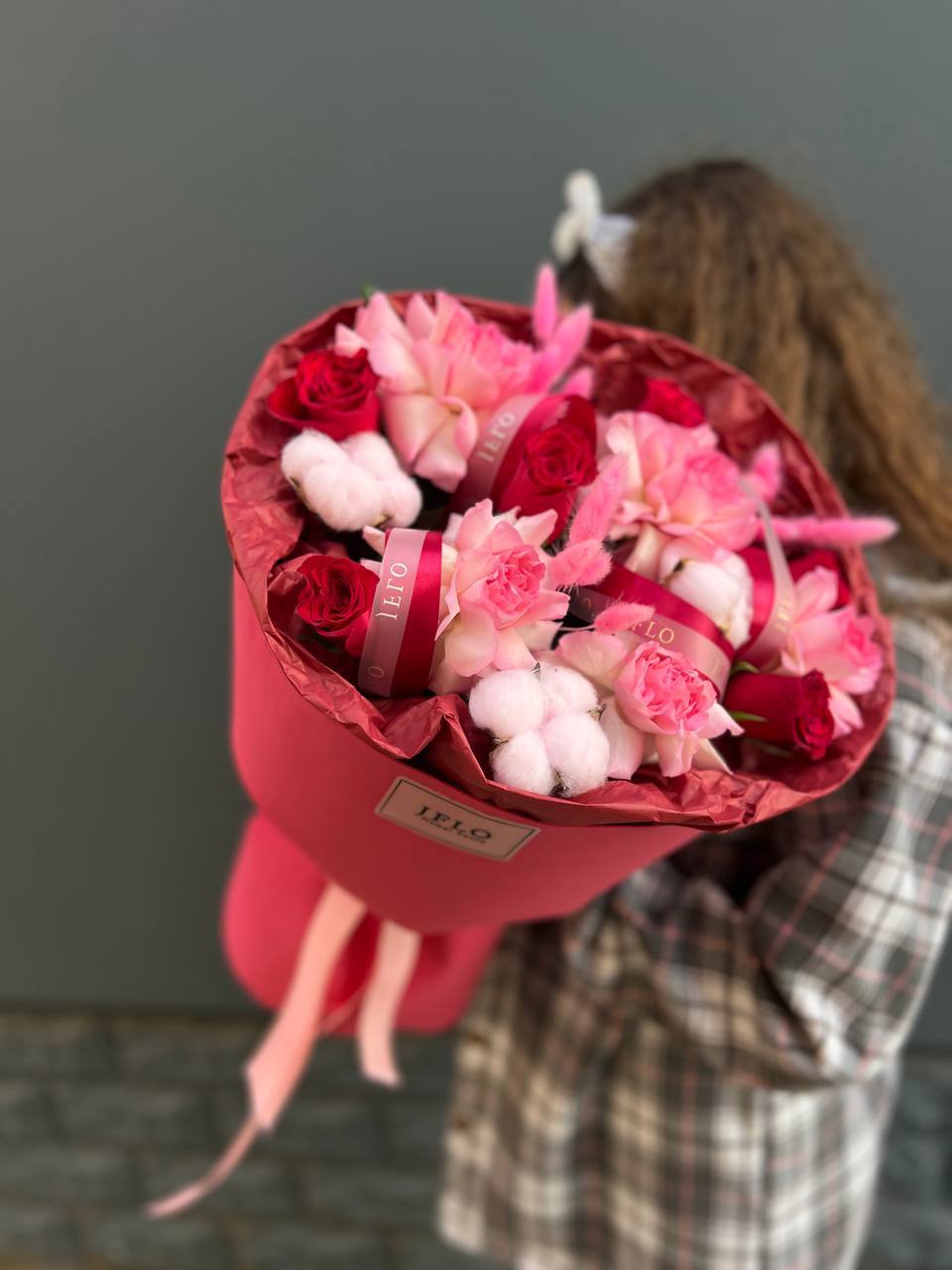 В центре внимания — фактуры и цвет! Современный, стильный букет, который сочетает бархатистые бутоны роз и мягкий хлопок. Это не просто цветы, а целая цветочная композиция для тех, кто ценит красоту в деталях. Отличный повод порадовать себя или близких!