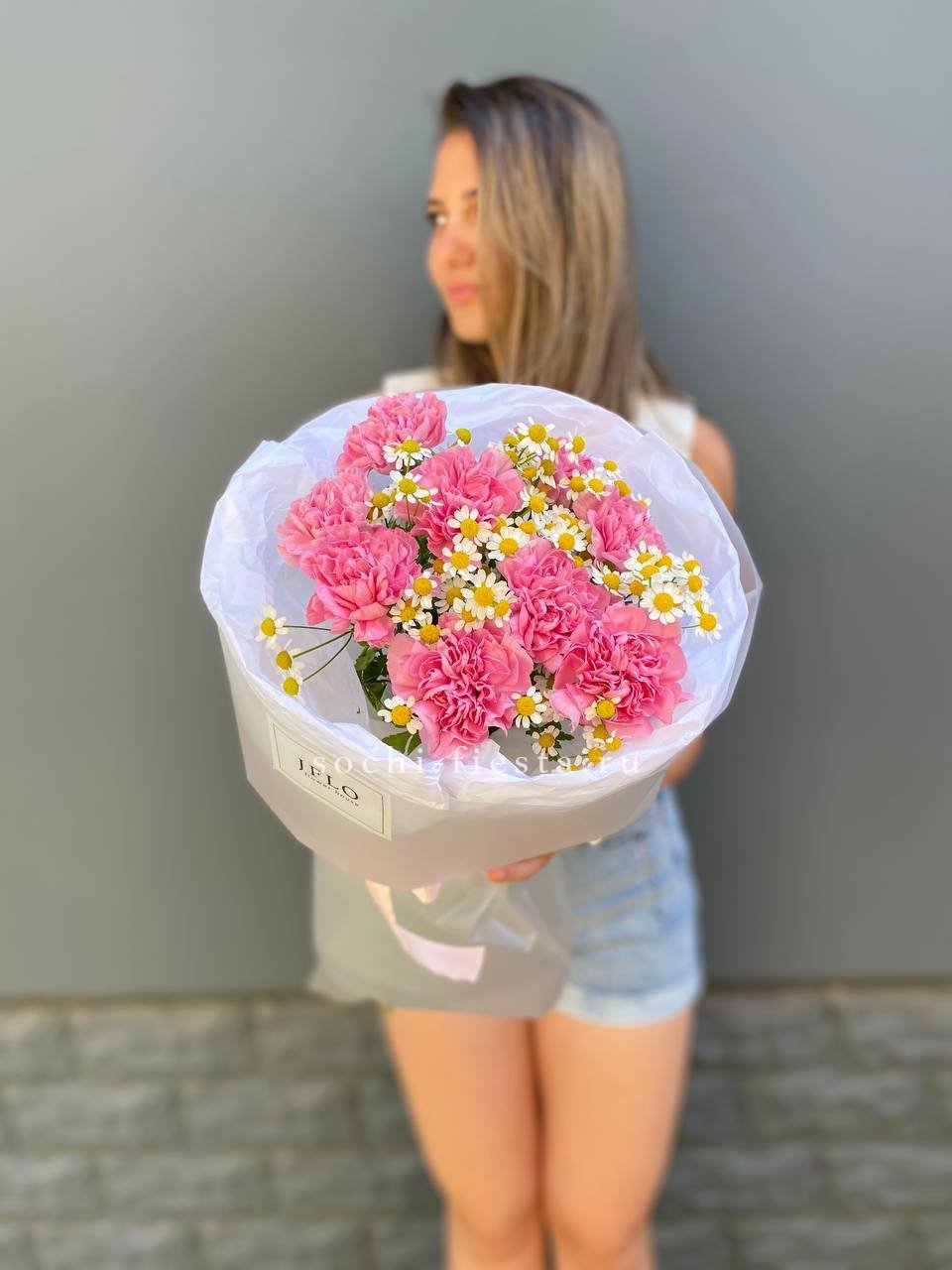 Два отдельных букета в одной композиции создают свободную асимметрию. Белые ромашки с открытыми серединками и пышные диантусы собраны так, что каждая часть читается самостоятельно, но вместе они держат общий ритм и объем.