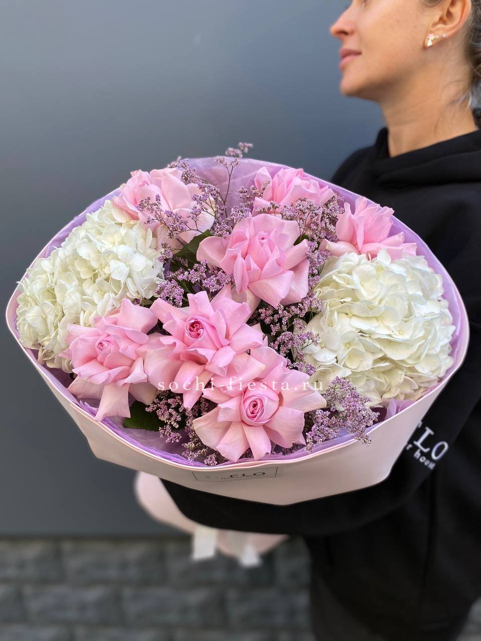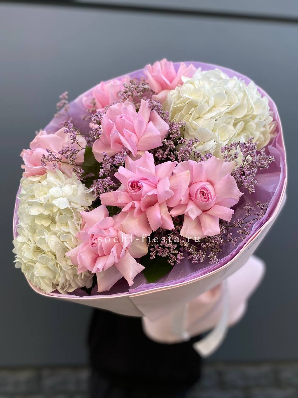 гортензия, пионовидные розы, пампасная трава (стифа), лента, дизайнерская упаковка.