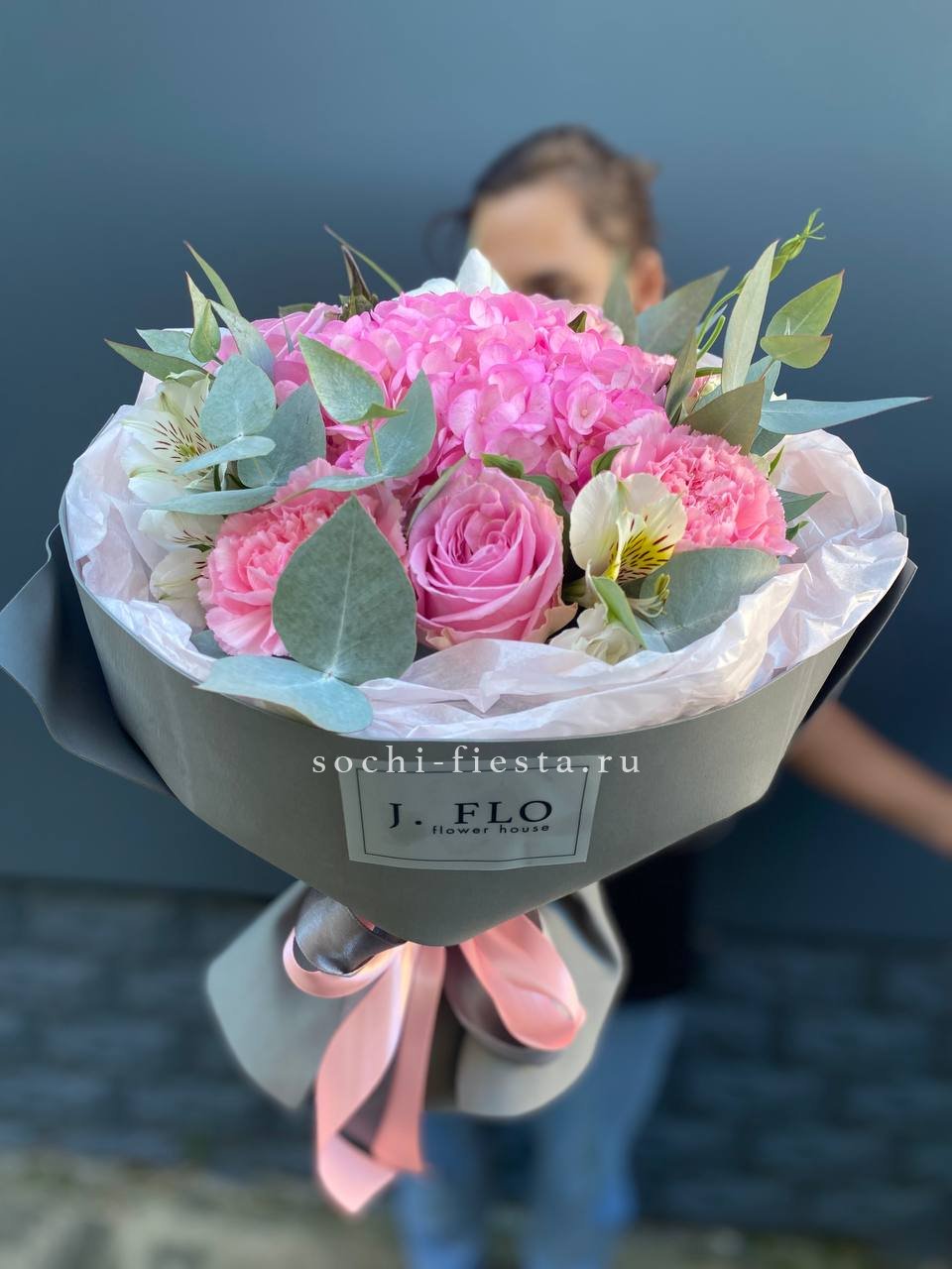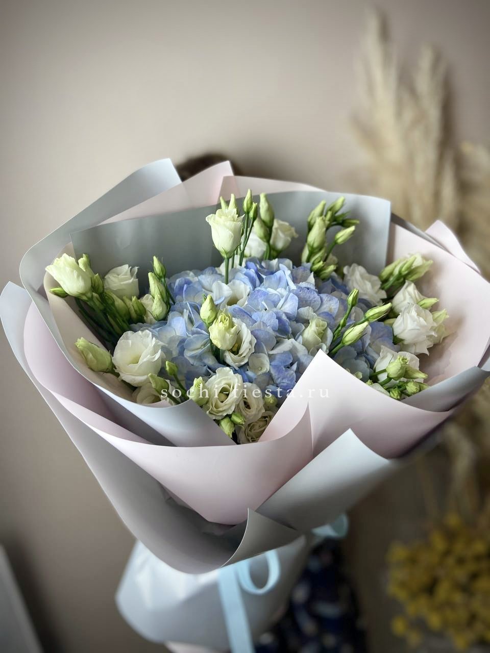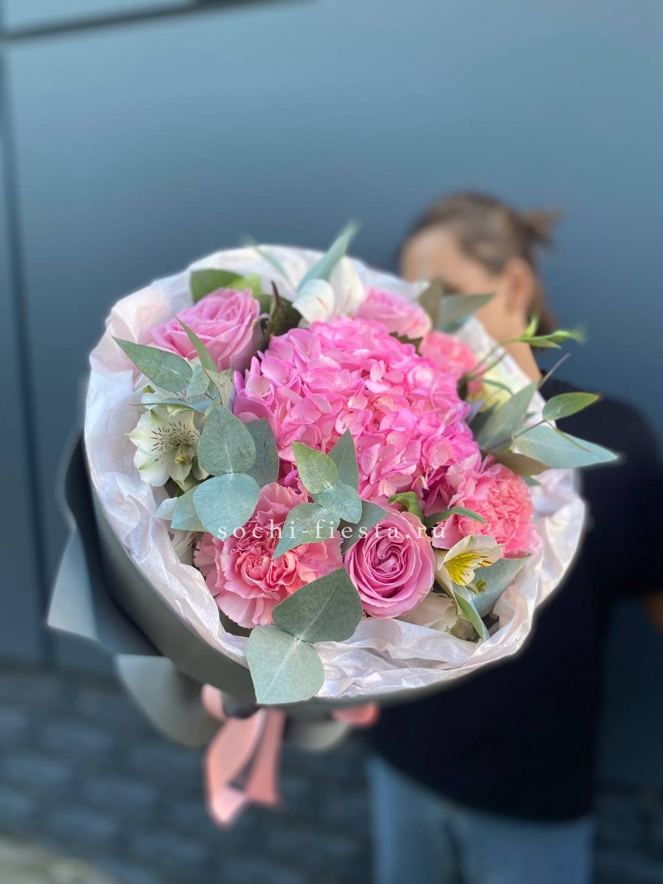 гортензия, пионовидная кустовая роза Мисти Баблс, лента, дизайнерская упаковка.