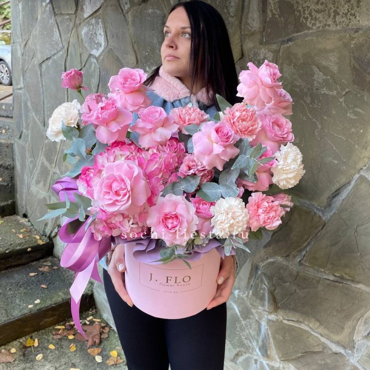 - Шляпная коробка с розами и гипсофилой — универсальный подарочный формат.