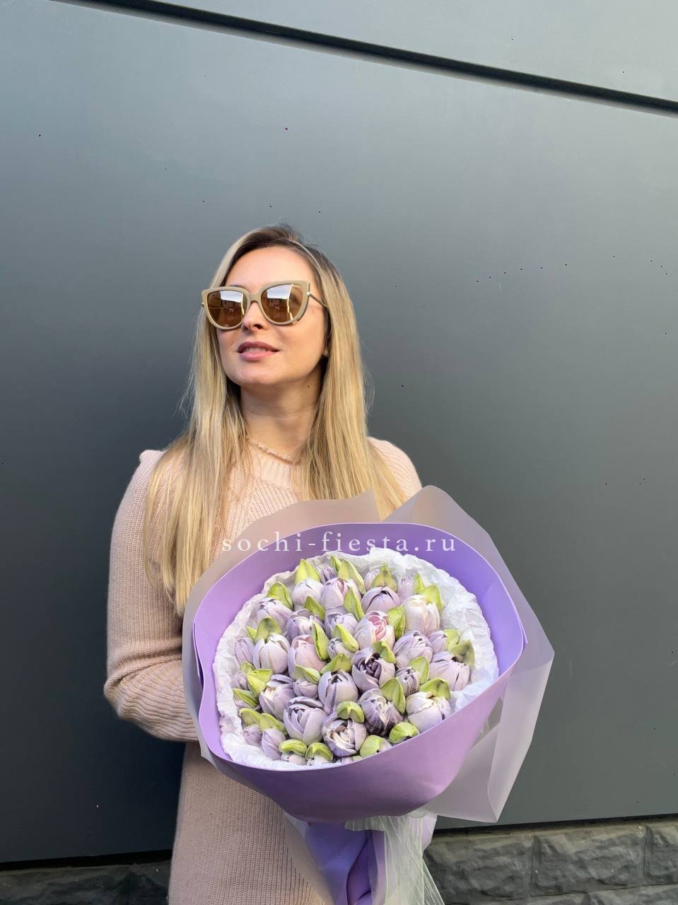 Фиолетовые тюльпаны из воздушного зефира собраны в объёмную композицию. Каждый бутон выполнен отдельно на яблочном пюре и пектине с натуральными красителями.